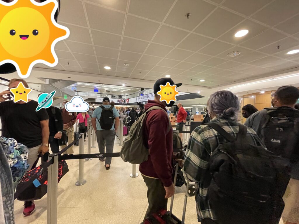 事前登録をすれば優先チェックインが可能なシステムを試験導入していたタイミングだったようで、特段用意していなかった私たちは合計1時間ほど列に並んだのではないでしょうか。その間に一人の男性が、フライト時刻まで20分しかないから列を譲ってほしいと後ろからやってきました。彼の鬼気迫る様子から快く譲った私たち。見守っていると何組かとは交渉難航している様子もありながら順調に譲ってもらっていました。呑気な私たちは彼の勇気に関心していました。
